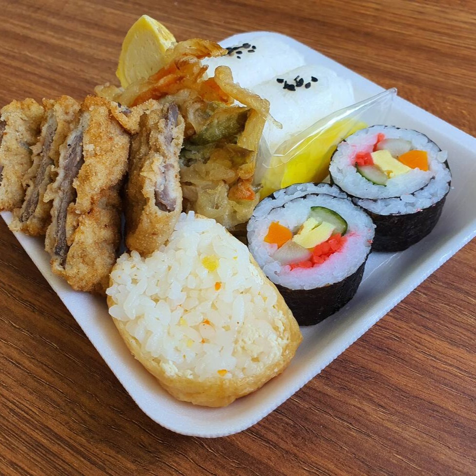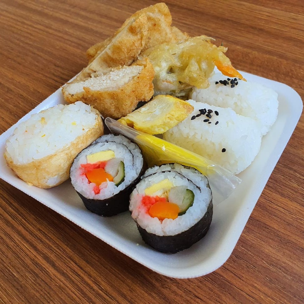 Refeição completa japonesa. Inclui 2 oniguiris, 1 inarizushi, 1 tempurá de legumes, 2 sushis tradicionais, 2 fatias de tsukemono (nabo em conserva), 1 fatia de omelete e 2 fatias de empanados de frango.