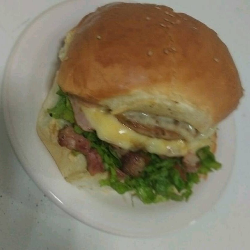 Pão de hambúrguer maionese presunto queijo tomate alface e hambúrguer....