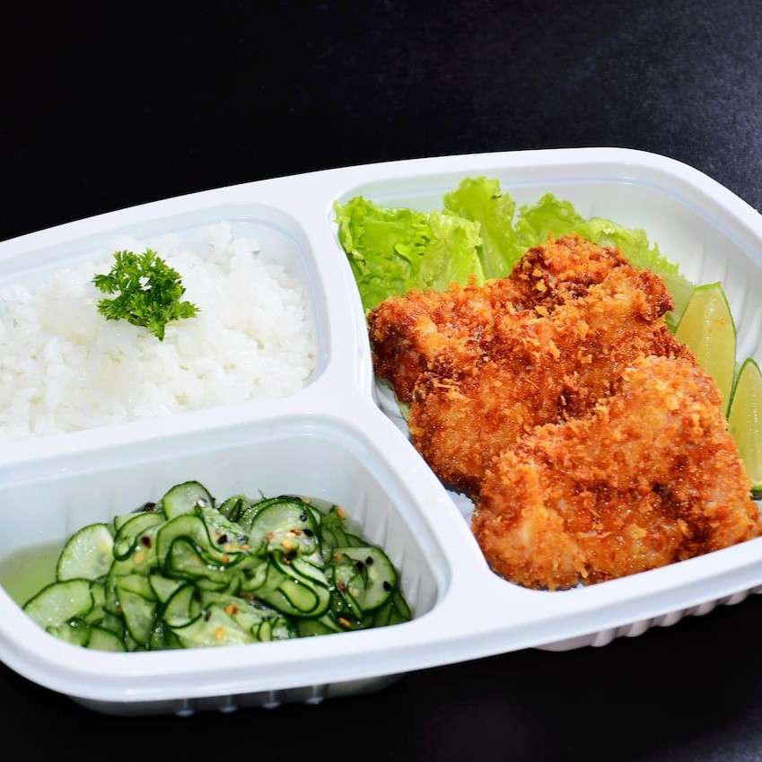 Lombo empanado e frito, Arroz e Sunomono. Prudutos frescos . Selecionados . Salada especial de pepino .