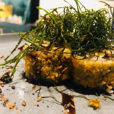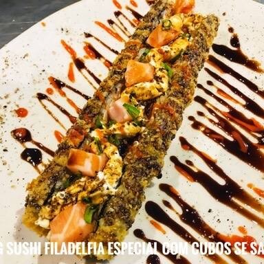Enrolado de sushi empanado na panko com molho tare e cobertura com crispy de couve . Sushi especial . Apreciado por muitos clientes . Aji sushi xaxim