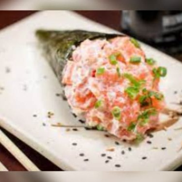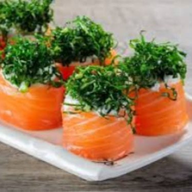 Bolinho de arroz, envolto em laminas de salmão, coberto com salmão picado e cebolinha