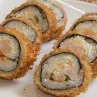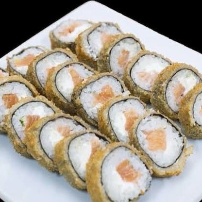 Arroz, nori, salmão, cream cheease, cebolinha, empanado na farinha panko e molho tarê