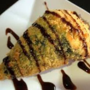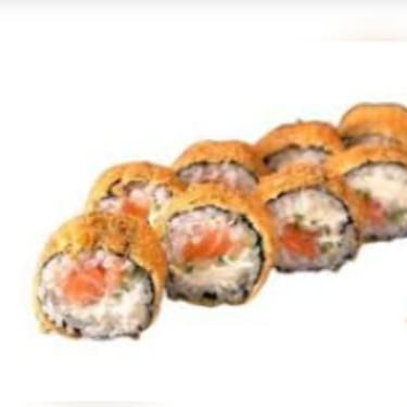 Sushi empanado na farinha panko, com recheio de salmão, cream cheese, cebolinha e molho tarê