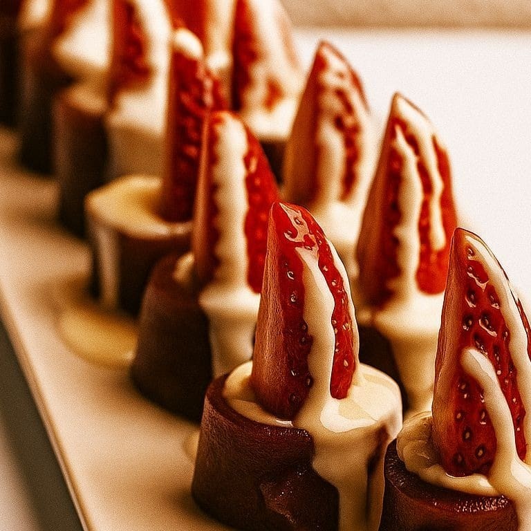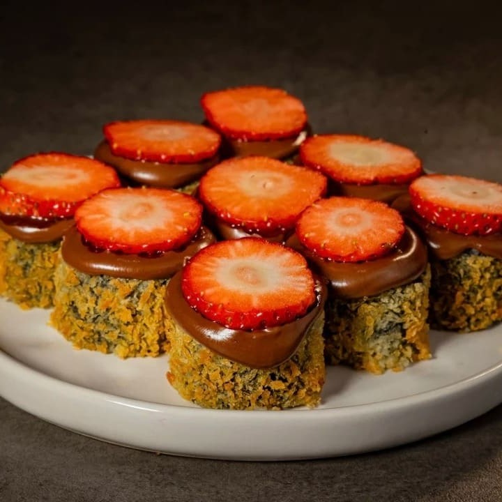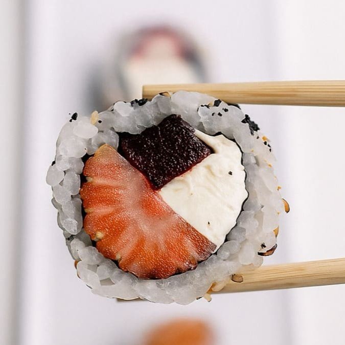 6 Unidades - Sobremesa de sushi doce que combina a doçura da goiabada, o frescor do morango e a cremosidade do cream cheese e finalizada com leite condensado e raspas de limão.