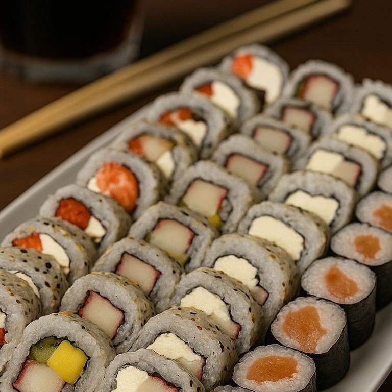 50 Peças: 10 Uramaki kani + 10 Uramaki Romeu & Julieta + 10 California + 10 Hossomaki salmão + 10 Hot Filadelfia *NÃO TROCAMOS OS ITENS