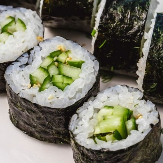 Refrescante e crocante! Rolinhos com pepino fresco envoltos em arroz e alga nori. Ideal para quem busca uma opção leve ou vegetariana.