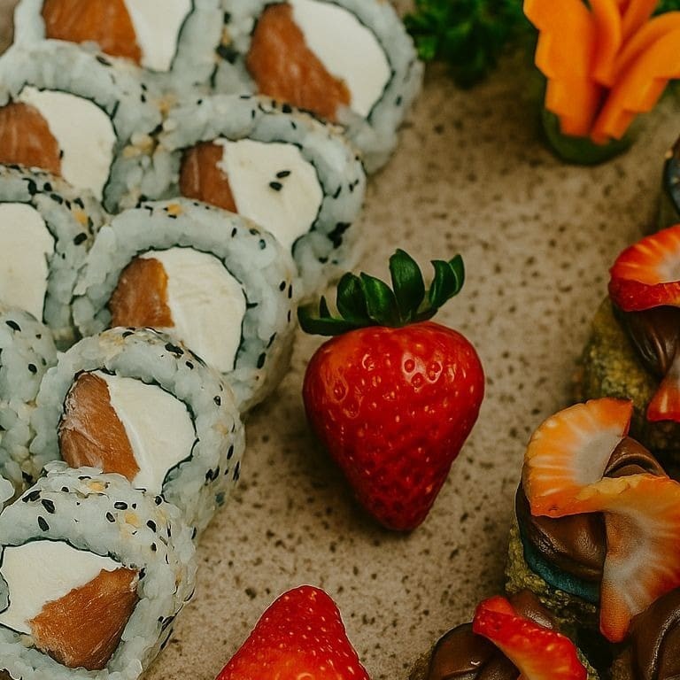Sushi doce empanado e frito, recheado com morango fresco, Nutella, cheam chese Crocante por fora, cremoso por dentro e finalizado Uma explosão de sabor!
