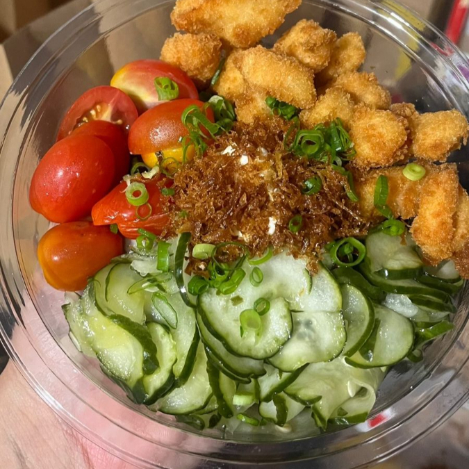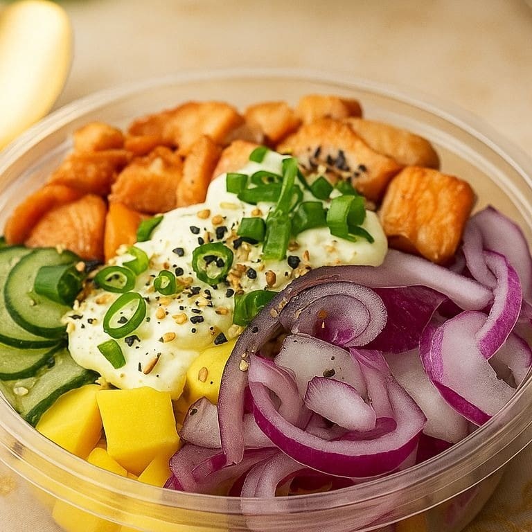 Poke: 100g de Salmão Grelhado, arroz, sunomono, creamcheese, cebola roxa, cebolinha, manga, gergilin e molho tarê, finalizado com batata doce crispy.