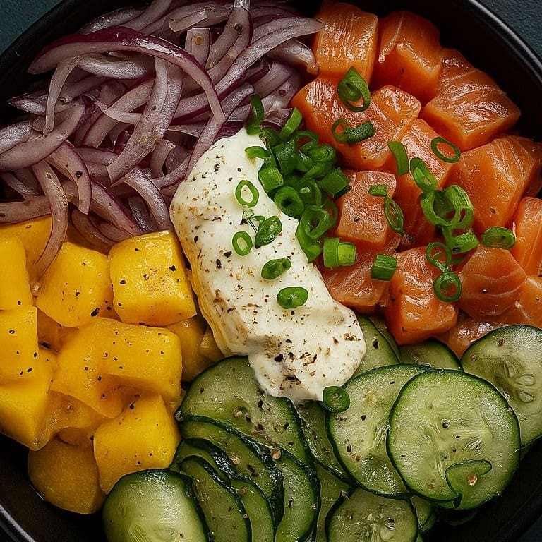 Poke: Salmão. Arroz, sunomono, creamcheese, cebola roxa, cebolinha, manga, gergilin e molho tarê.
