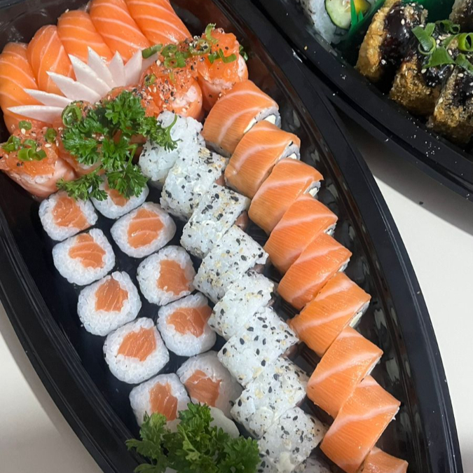 50 Peças: 10 Uramaki Filadélfia + 10 Hossomaki Salmão + 10 Uramaki Filadelfia Especial + 10 Sashimi Salmão + 5 Niguiri Salmão + 5 Joe salmão