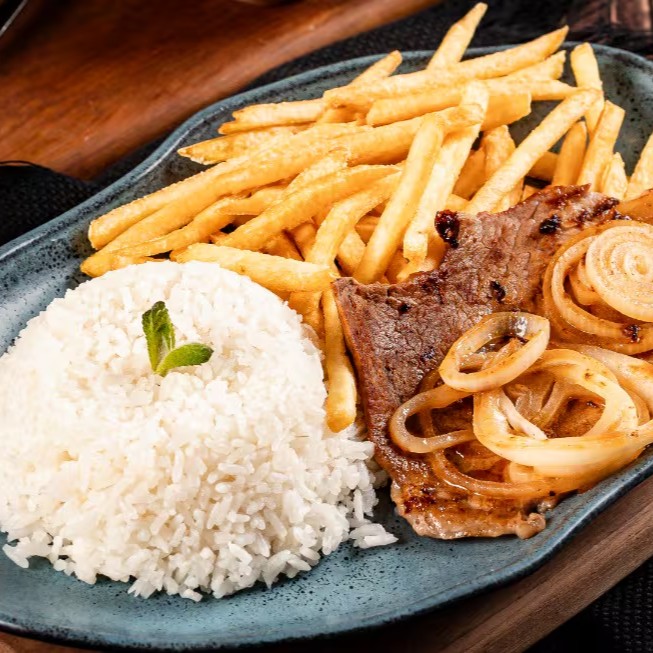 Nosso Bife Acebolado Executivo é uma verdadeira viagem gastronômica! É composto por um suculento bife de aproximadamente 160g, cuidadosamente grelhado ao seu gosto e coberto com cebolas douradas e caramelizadas. Acompanha arroz branco soltinho, feijão preto cremoso e batatas fritas crocantes, douradas por fora e macias por dentro. É um prato de sabores ricos e texturas contrastantes que promete deixar seu paladar maravilhado. Uma opção perfeita para quem procura uma refeição completa e deliciosa.