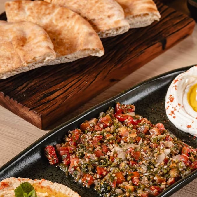 70g de Coalhada, 70g de Homus, 70g de Tabule e 1 unidade de Charuto. Acompanha pão Sírio.