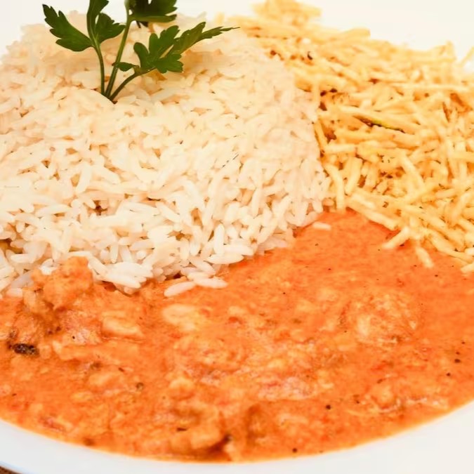 Delicioso Strogonoof de frango, acompanha arroz e batat palha.