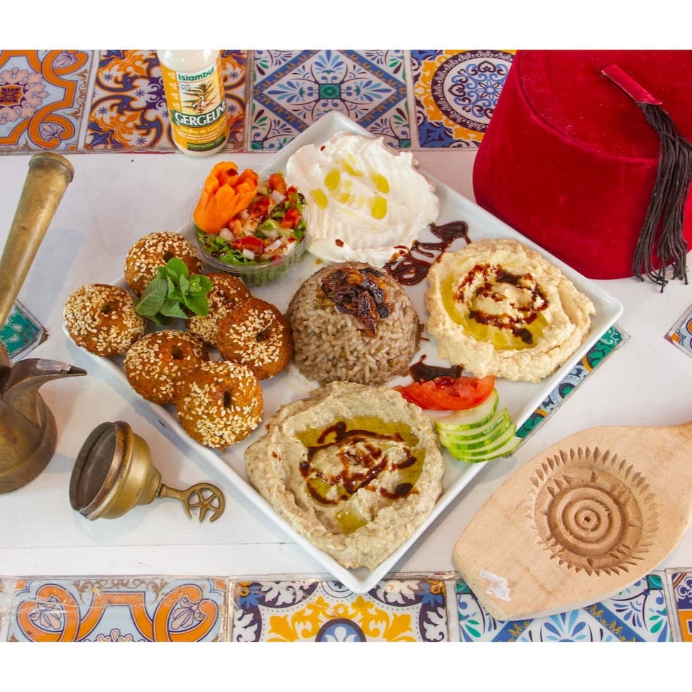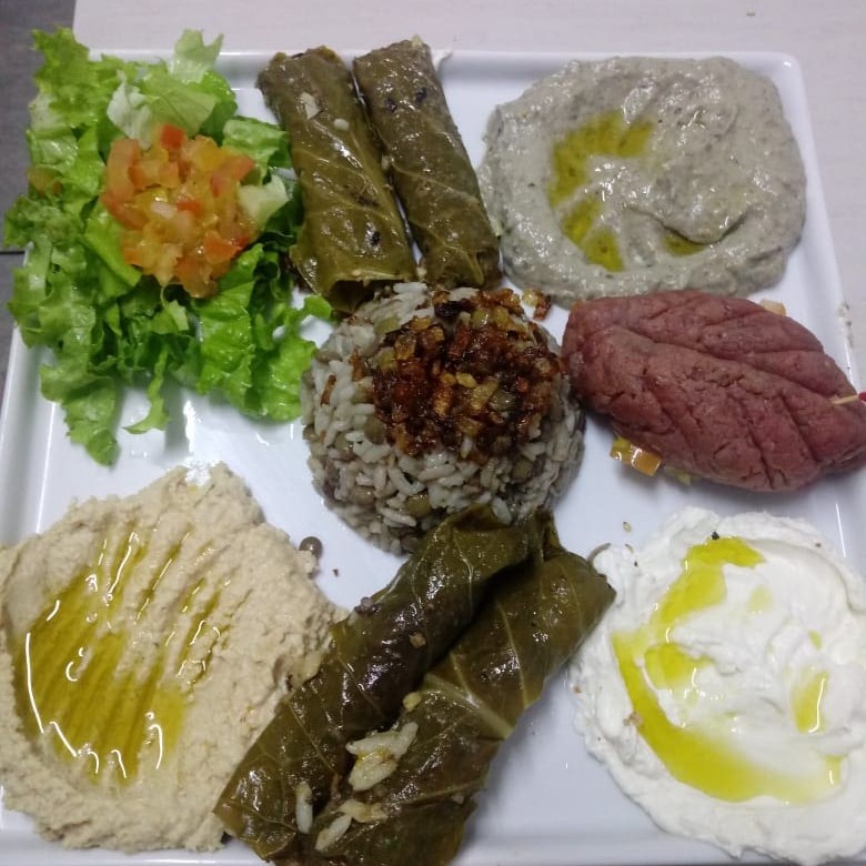 Arroz com lentilha , 3pastas (coalhada, humos e babaganuche),salada , kibe cru , 2 charutos , e kafta. Acompanha pão sírio.