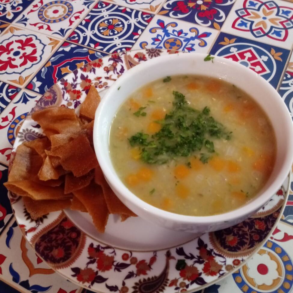 Sopa de lentilha com pao sirio frito
