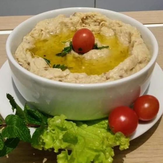 Pasta de berinjela com molho de tahine, acompanha pão sírio