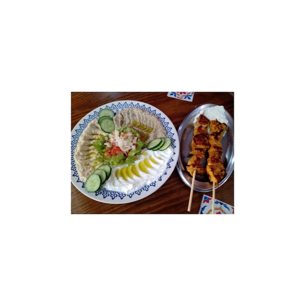 3 pastas (coalhada , babaganuche,humos.) 2 espetos de frango , salada Acompanha pao sirio