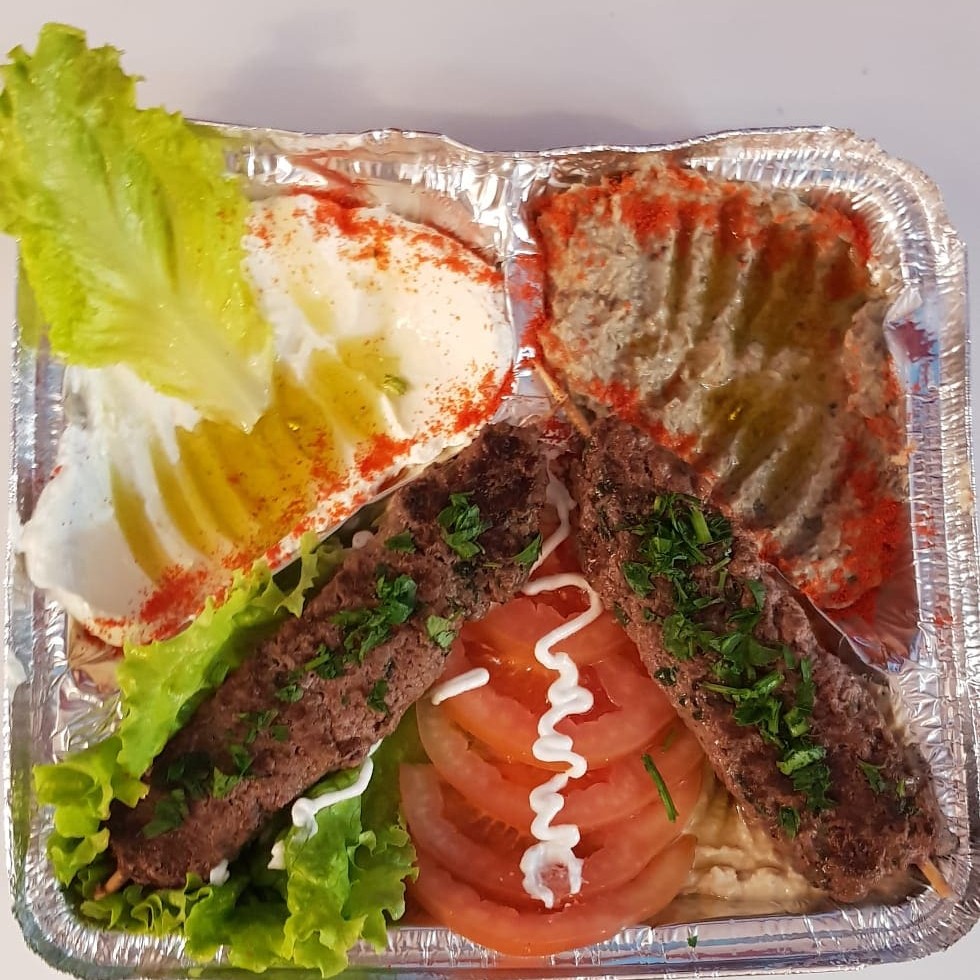 2 espetos de kafta . 3 pastas (homus,coalhada seca , babaganuche .) salada acompanha pao sirio