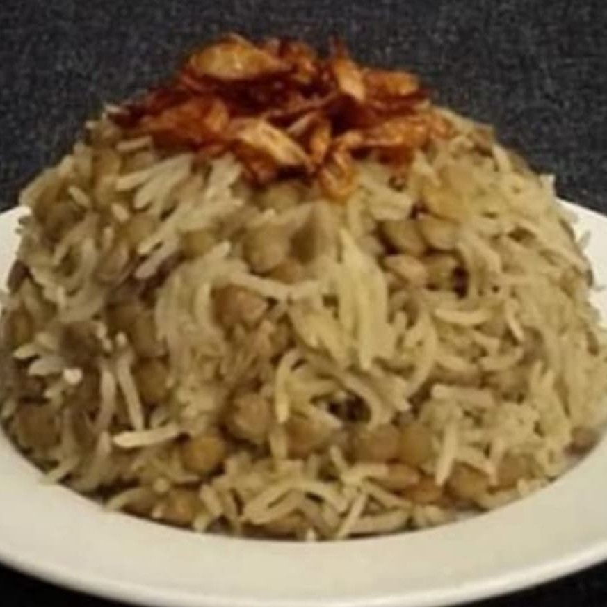 Arroz com lentilha , cebola frita.