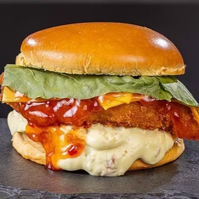 Nosso delicioso pão brioche, peito de frango empanado, duas fatias de queijo prato, rúcula, geleia de pimenta e molho bacon Alexandria.