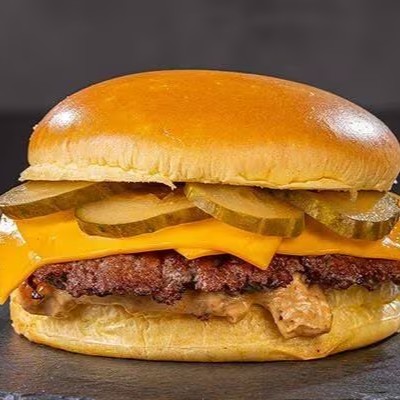 Pão, smash burger 120g, queijo cheddar, picles de pepino e maionese Alexandria.