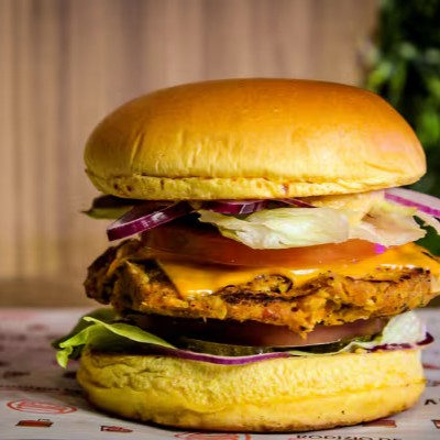 Smash burger vegetariano: grão-de-bico, alho, cebola, curry, farinha de rosca, linhaça, azeitonas pretas, sal, páprica doce, defumada e picante, manjericão e cebolinha. Queijo cheddar, cebola roxa, pepino, alface, tomate e molho especial Alexandria.