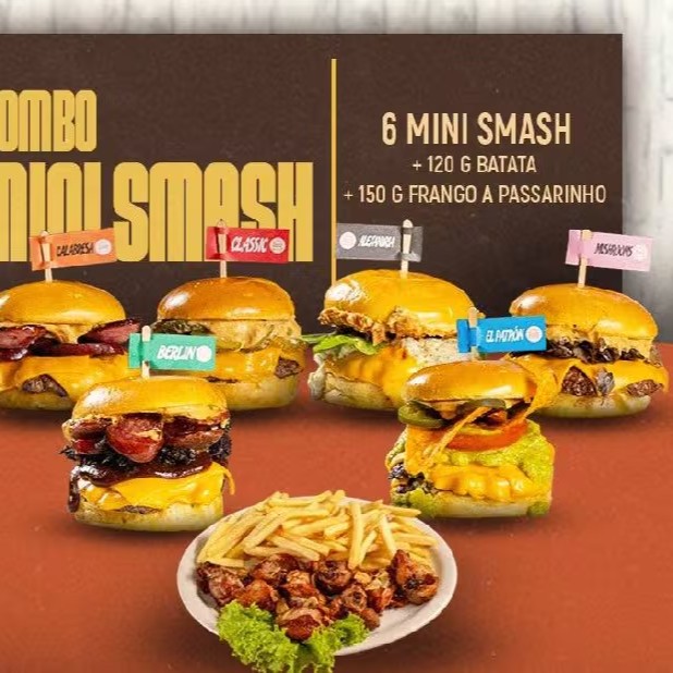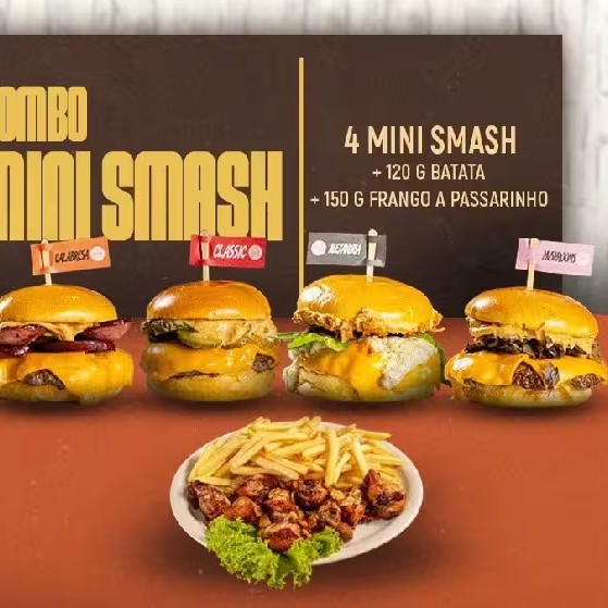 Você escolhe 6 opções de mini smash burgers de sua preferência. Acompanha uma porção de 150g de frango à passarinho e uma batata de 120g..