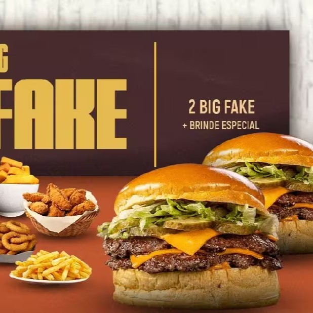 2 Big Fake: nosso delicioso pão brioche, 2 carnes bovinas (total de 160g em cada lanche), 2 fatias de queijo cheddar, alface americana, cebola roxa picada, picles e molho especial Alexandria.