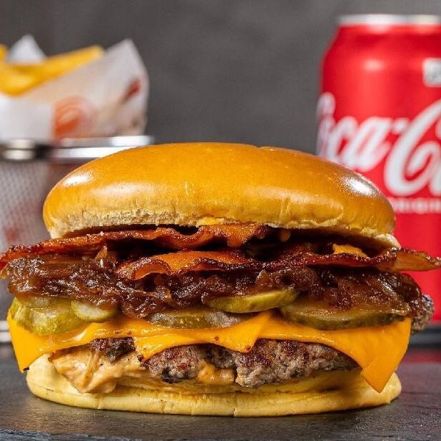 2 Melt Bacon: Pão Brioche, Carne Bovina (160g), Cheddar Melt, Cebola Caramelizada e Duas Fatias de Bacon Crocante. Acompanha Uma Porção de Fritas com Cheddar e Bacon (100g) + 2 Latas de Coca-Cola.
