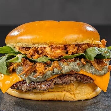 Pão, smash burger 160g, queijo cheddar, creme de queijo gorgonzola, molho especial Alexandria, cebola crispy e rúcula.