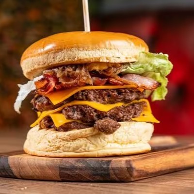 Três, isso mesmo, você não leu errado! Três hambúrgueres bovinos empilhados 80g cada, queijo cheddar entre as camadas, cebola caramelizada, bacon em fatia, alface americana.