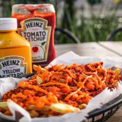 Porção de Batatas Fritas Coberta Com Nossa Receita Caseira de Cheddar Alexandria e Bacon Triturado.