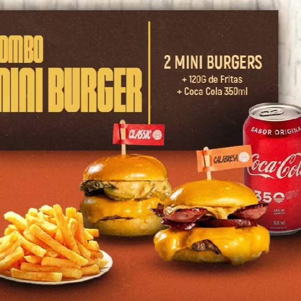 Você escolhe os seus 2 mini smashs preferidos! Acompanha fritas pequenas e uma Coca-Cola lata.