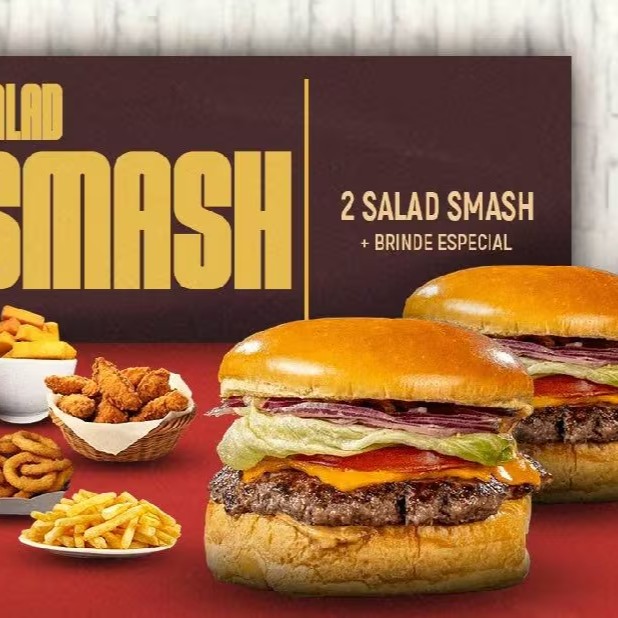 2 Salad Smash: pão brioche, smash burger de 120g, 2 fatias de cheddar derretido, tomate, alface crocante e cebola roxa e molho Alexandria. Acompanha Brinde Especial Da Sua Escolha.