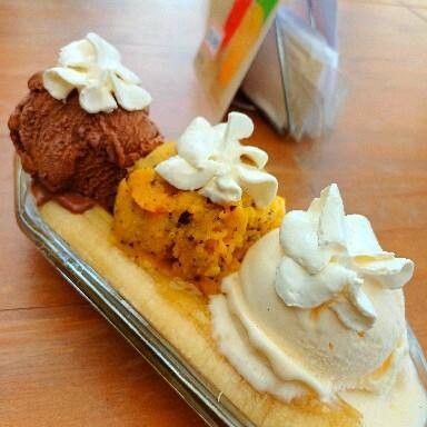 Banana, três sabores de gelato da sua preferencia, calda e chantily.