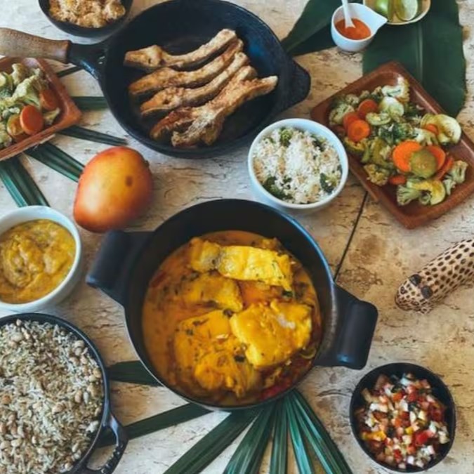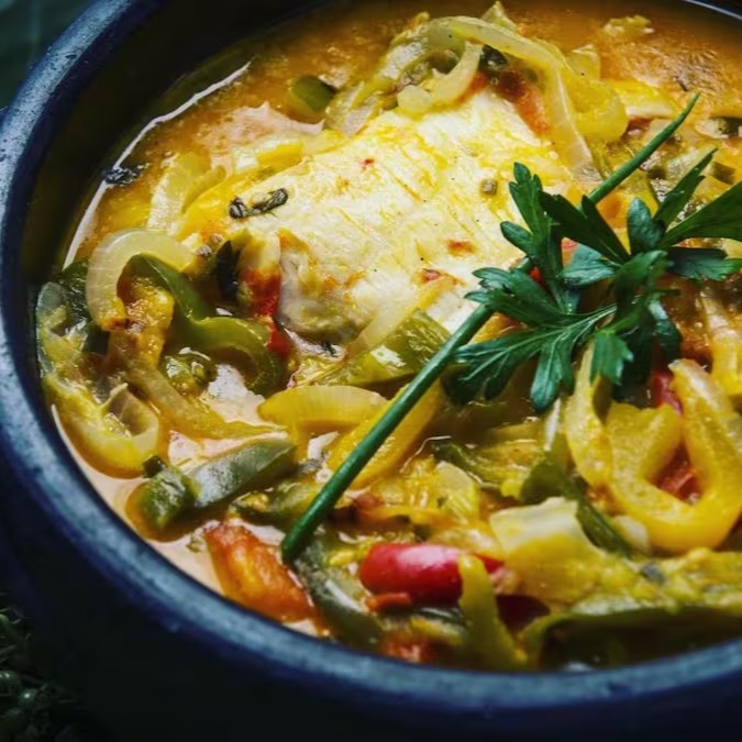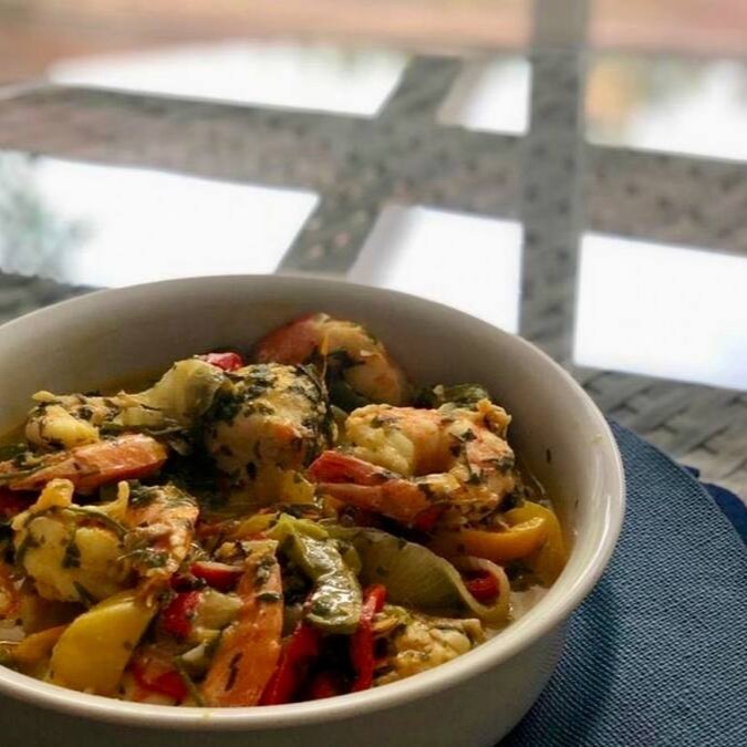 Moqueca Filé de Tilápia com Camarões e legumes sortidos. Acompanha baião de dois e pirão vegano. (peso crú do peixe 400g e do camarão 200g). Prato Magnífico.