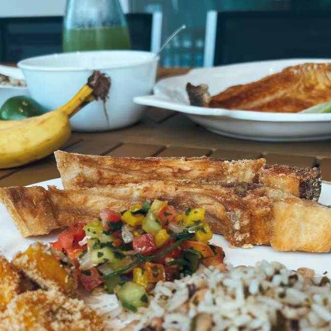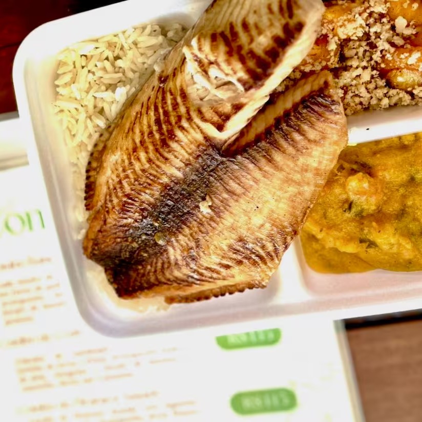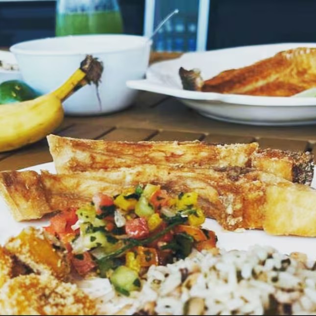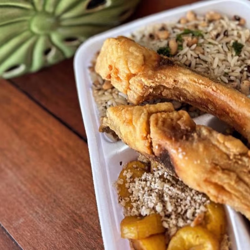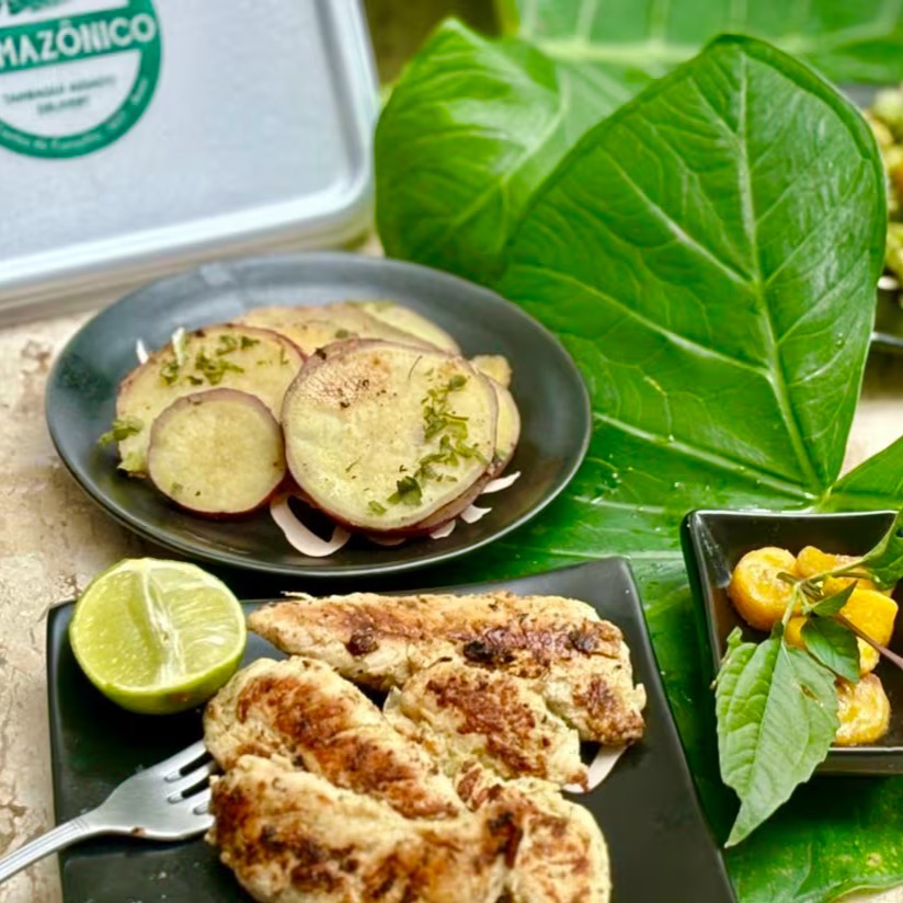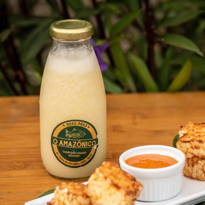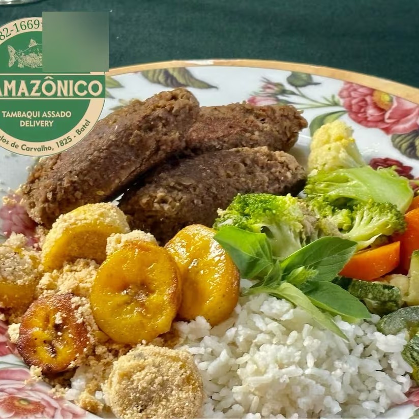 Ícone da culinária Amazonense, as Costelas de Tambaqui ventrecha (inclui além da costela do peixe uma porção do lombo) , empanadas em farinha de arroz e fritas em óleo vegetal. Acompanha baião de dois, farofa com castanha e banana da terra e vinagrete. Usamos Manteiga vegana feita pelo próprio Amazônico (leite de aveia, azeite de oliva, azeite vegetal, chia e ervas finas).