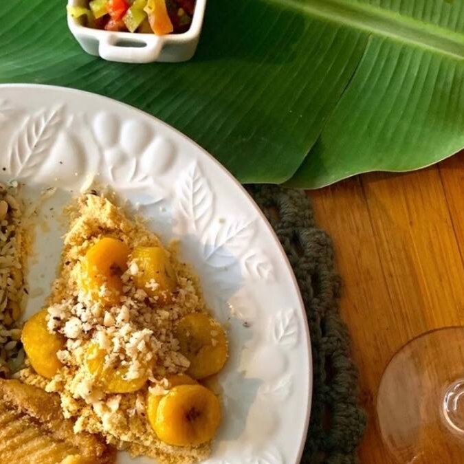 Sucesso da casa. Farinha de mandioca torrada na manteiga vegetal com castanha e banana da terra assada (500ml). Usamos Manteiga vegana feita pelo próprio Amazônico (leite de aveia, azeite de oliva, azeite vegetal, chia e ervas finas).