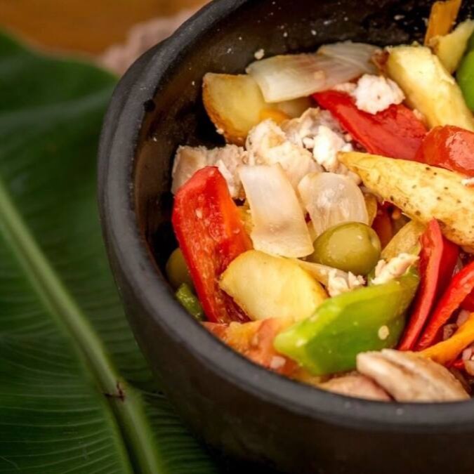 Versão do Amazônico do Bacalhau Brasileiro. Filé de Pirarucu assado (peso cru: 400g), cebola, tomate, pimentões coloridos, azeitona e batata, regado no azeite de oliva. Acompanha arroz branco e pirão sem caldo de Peixa (vegano).