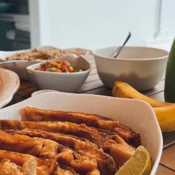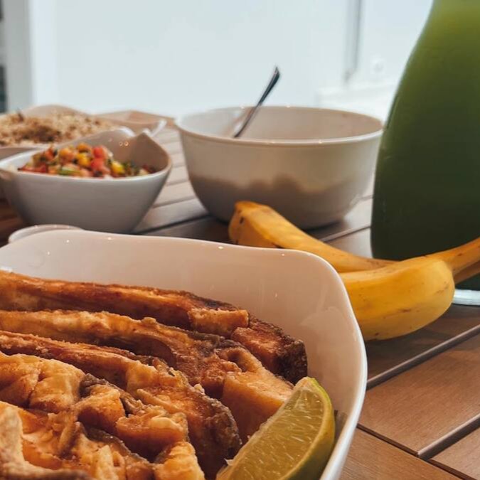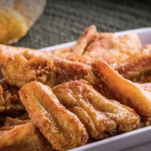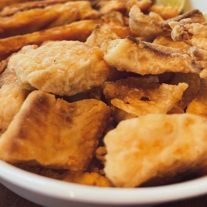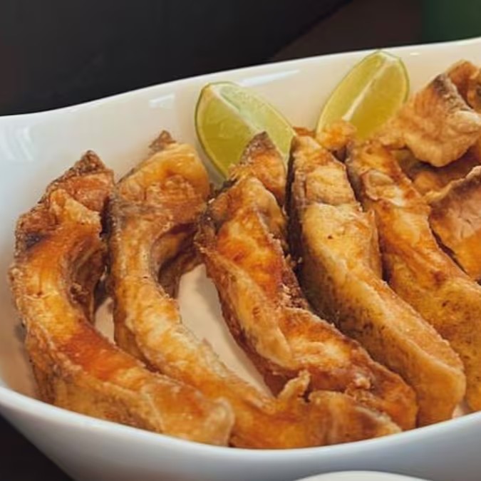 Porção de Costela de Tambaqui empanada na farinha de arroz e frita em óleo vegetal (400g de peso cru). Serve super bem.