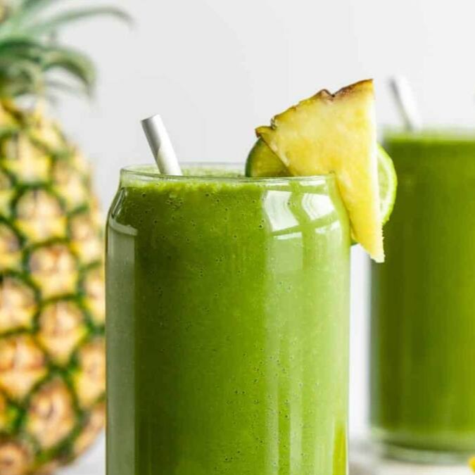 Polpa Mista de Abacaxi, Limão, Couve, Hortelã, Gengibre e Chá Verde, batida com água sem adição de açúcar (300ml).