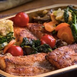 Filé de Pirarucu assado com legumes sortidos. Acompanha baião de dois e pirão. 800g de peixe sem espinha (peso antes de assar). Um dos pratos de maior sucesso, experimente. Legumes al dente.