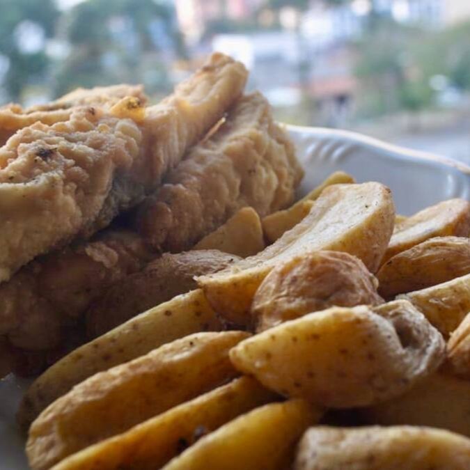 Releitura do famoso #Fishn'Chips Londrino. Lombo de tilápia cortado em tiras, untada sem farinha de arroz Fritas (300g); e batatas fritas (300g). Sem espinha, uma iguaria incomparável