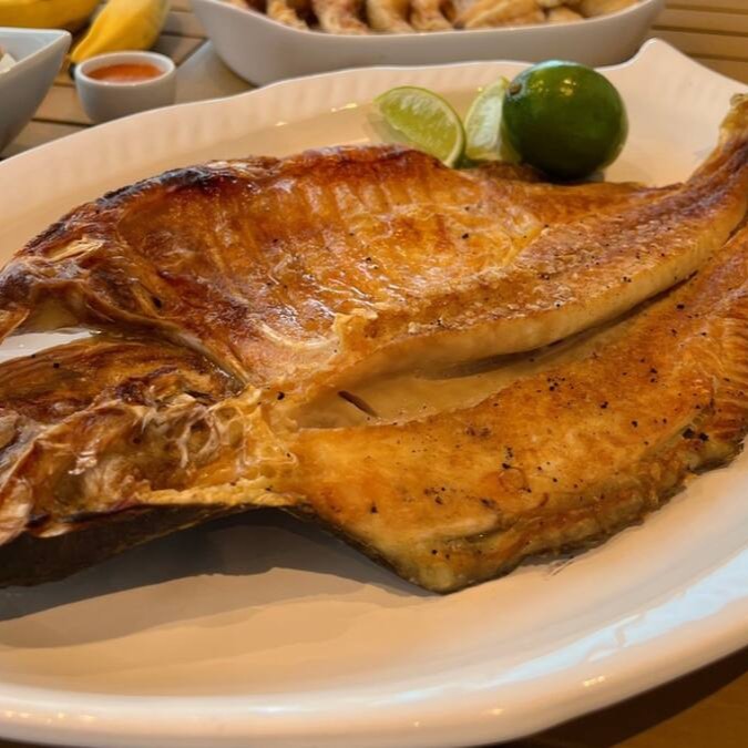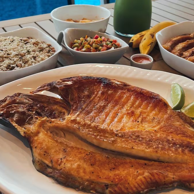 Prato mais famoso de Manaus. Deliciosa Banda de tambaqui assada (∼ 1200g in natural). Acompanha baião de dois (∼ 800g) farofa com castanha e banana da terra (∼ 250g) e vinagrete (∼ 400g). Usamos Manteiga vegana feita pelo próprio Amazônico (leite de aveia, azeite de oliva, azeite vegetal, chia e ervas finas). #Bandadetambaqui #highprotein #peixedaamazonia Glúten Free #celiacos