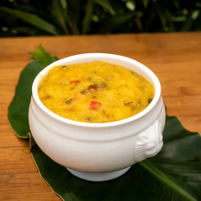 Sensacional Pirão cremoso elaborado com tomate, cebola, salsinha, leite de coco, azeite de dendê e farinha de mandioca. Usamos Manteiga vegana feita pelo próprio Amazônico (leite de aveia, azeite de oliva, azeite vegetal, chia e ervas finas). Sem caldo de peixe (500ml).