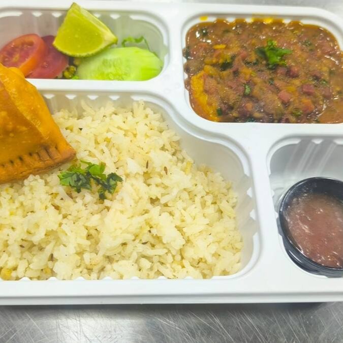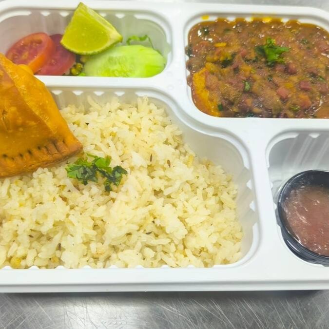 Feijão vermelho feito com molho de tomate, cebola, alho, gengibre e com especiarias da índia - Garam masala, curry e coentro. Prato acompanha samosa tradicional, arroz - zeera rice, salada e molho.