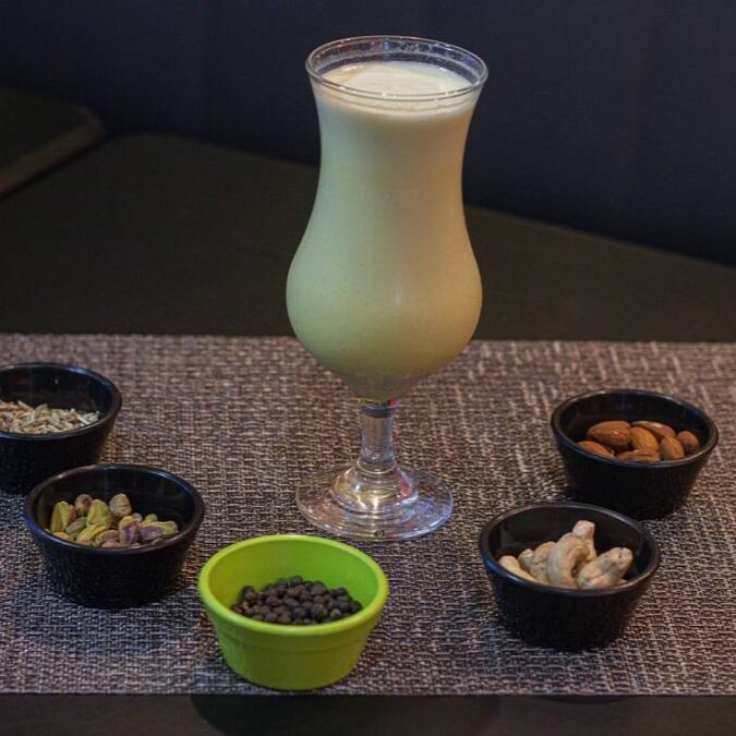 Bebida indiana fria preparada com uma mistura de amendoas, castanha de caju, petalas de rosa, pimenta de reino, pistache, cardamomo, leite e acucar