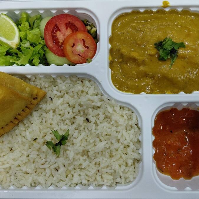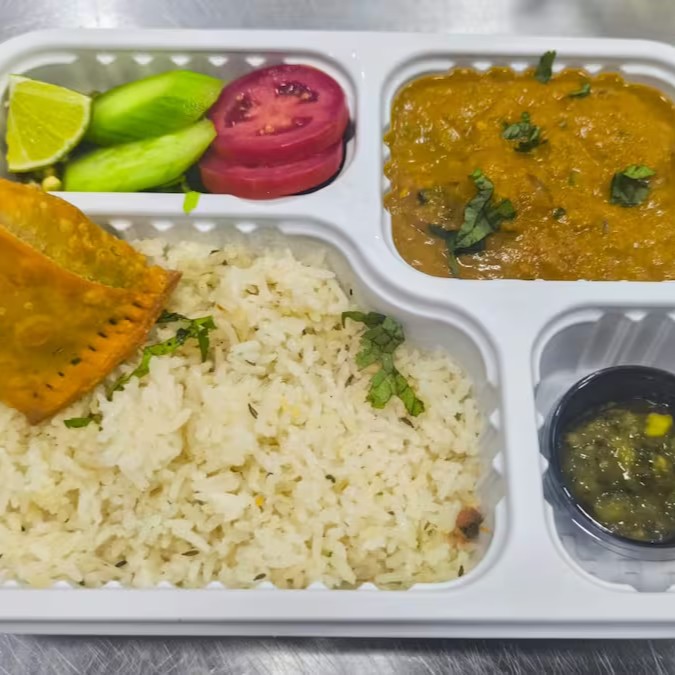 Lentilha cozida e temperada com especiarias indianas. Acompanha: mini samosa, zeera rice, salada e molho indiano.