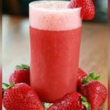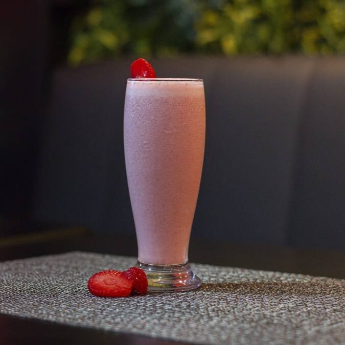 Bebida a base de iogurte com polpa de morango.