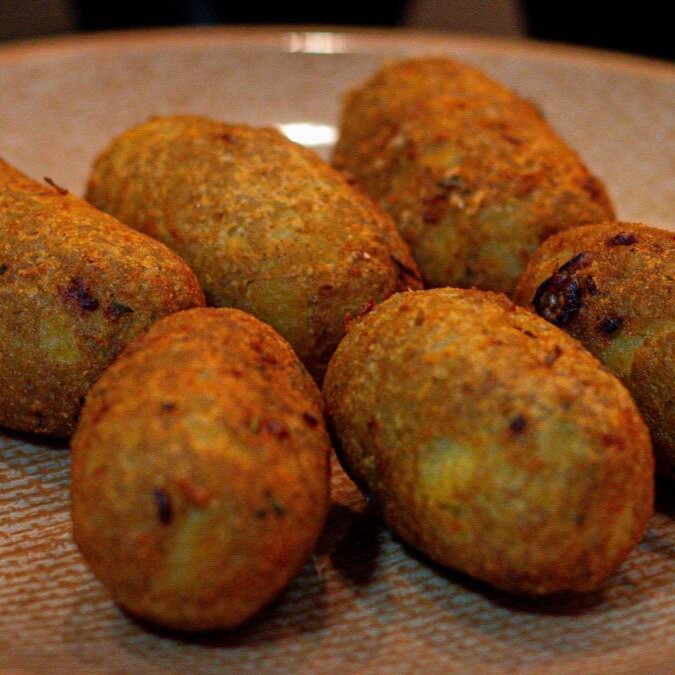 Bolinhos fritos feitos com batata e legumes.